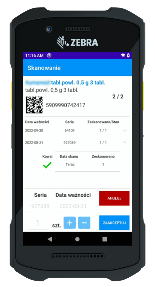 Dzięki rozwiązaniu KS-APTIX zweryfikujemy ilości zakupionych towarów, poprawność serii i daty ważności a także sprawdzimy poprawność opakowania w systemie KOWAL, dzięki czemu możemy wychwycić problematyczne opakowania już na etapie przyjmowania ich na magazyn. Wszystko to mobilnie, w dowolny miejscu w aptece, mając w ręce wygodne i ergonomiczne urządzenie, na którym znajdziemy wszystkie niezbędne informacje, nie zajmując przy tym żadnego z istniejących stanowisk komputerowych. Doskonałej jakości czytnik 2D pozwala na pracę o znacznie większej szybkości w stosunku do rozwiązania opartego o komputer i tradycyjny czytnik. Integracja z systemem KS-AOW pozwala na przeglądanie wyników weryfikacji z programem APW13 Zakupy przez inną, odpowiedzialną osobę. Może ona podjąć decyzję o sposobie rozwiązanie problemu niegodnych pozycji np. poprzez automatyczne przygotowanie reklamacji do hurtowni w związku z niepoprawnymi seriami lub datami ważności.